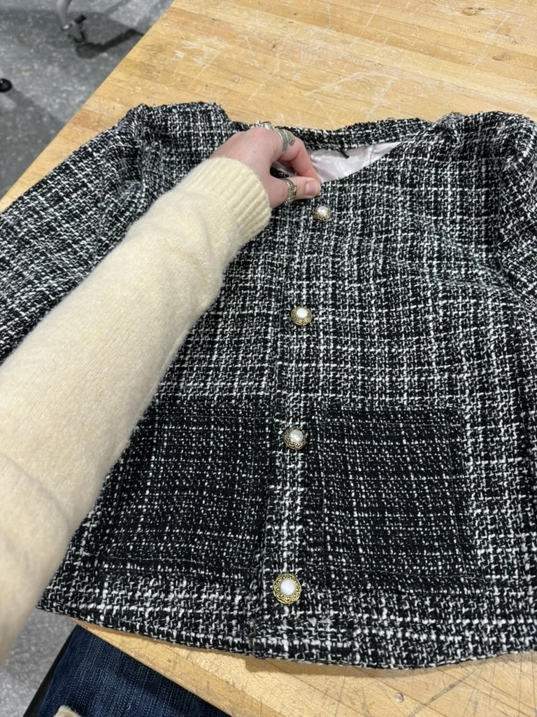 The final design features magnetic clasps sewn onto the inside of the jacket, while decorative buttons line the outside. To combat Alexis’s difficult with aligning buttons, only 3 magnets are used on the inside and spaced far apart. After testing with Alexis, we found this setup maximized security of the jacket while still making dressing as easy as possible. The jacket also features inner satin lining to combat material sensitivity.