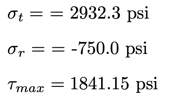 Substituting final dimension values (after iterating), the following stresses were calculated at r=ri, the critical stress location: