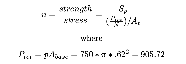 To analyze our fasteners, we began by selecting SAE grade 5 bolts for both availability and strength (Sp=85×103 psi). We determined that dm ≤ .35", as the distance between the edge of the flange and the outer diameter of our O-ring groove is .4". Additionally, we found an approximate tensile area, At, with the following equation: